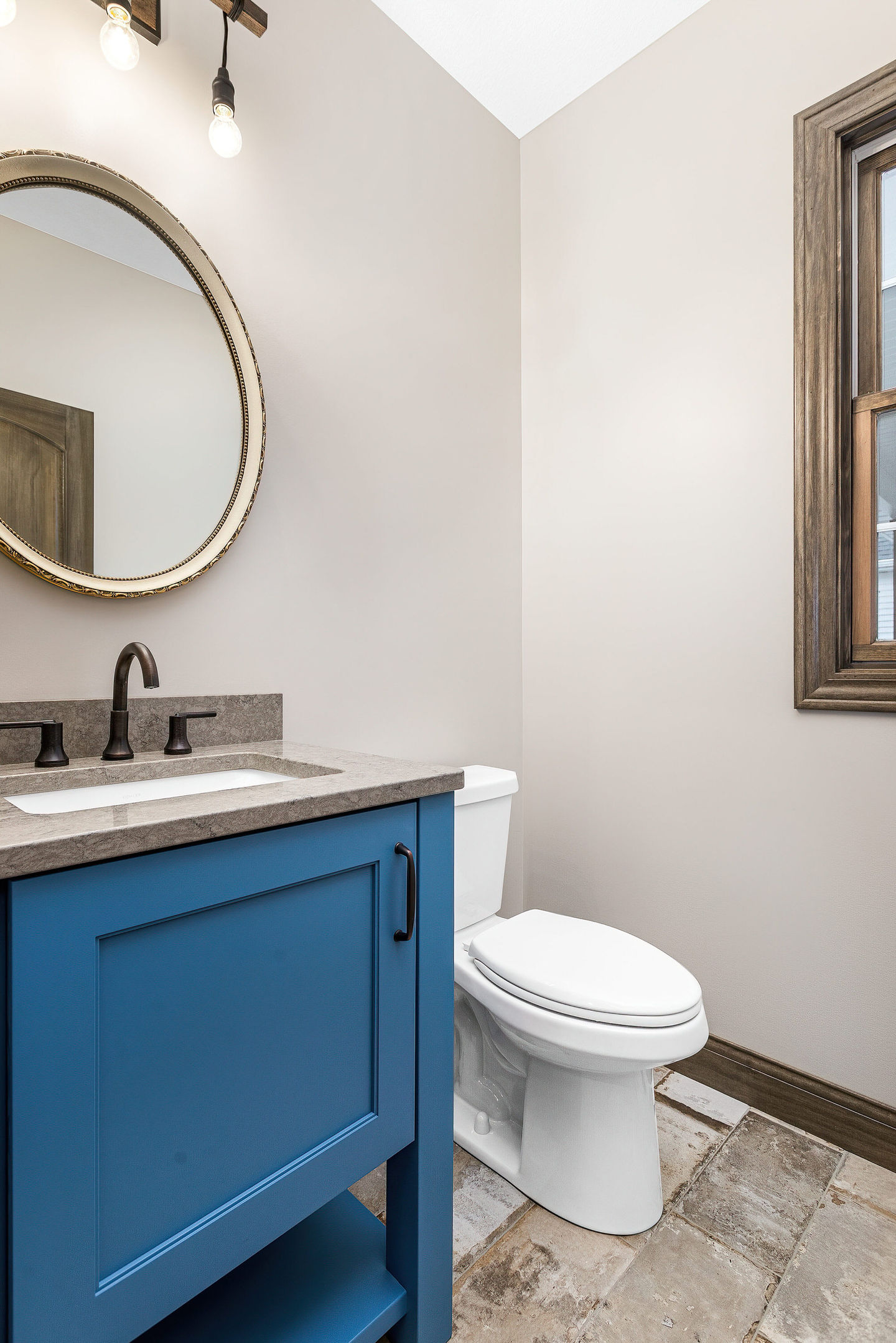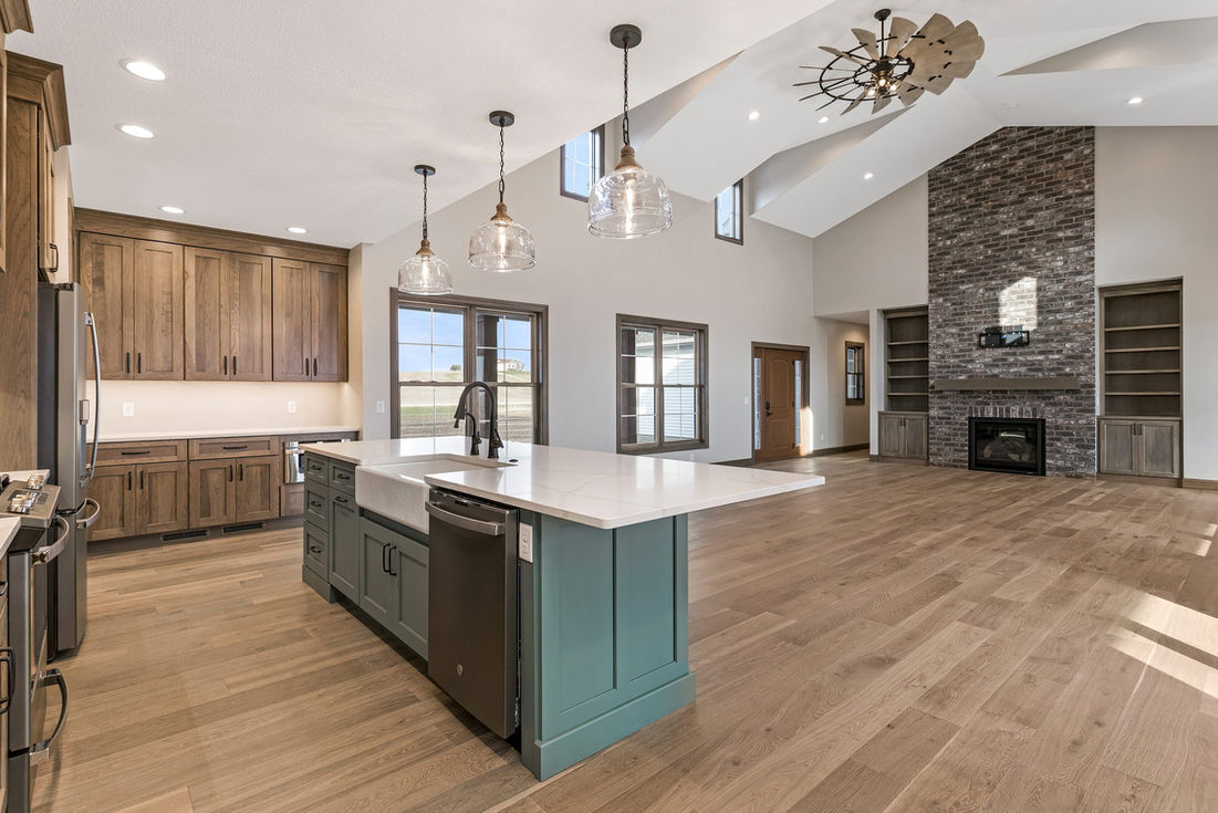 A custom farmhouse ranch that showcases pops of color throughout its design. This project features a vaulted great room, large windows throughout, and rustic interior millwork, making it a truly unique and beautiful space.